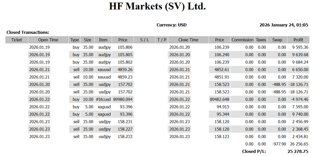 ✅ Trading Results (Jan 19 – Jan 23) 📊 Weekly Total: +25,278 USD 📌 Market Overview This week was not about building a trend. It was a battle of attrition, where risk factors existed simultaneously for each major currency. For the yen: → Japan’s fiscal concerns and election mode made it vulnerable to selling. […]