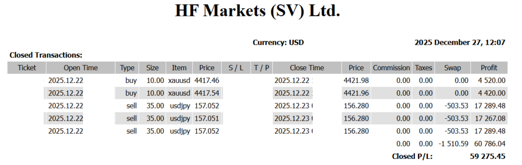 💰 +59,275 USD — Flash-Crash Risk! “How to Win Even in Thin Holiday Markets” — Year-End Strategy Period: Dec 22–26, 2025Weekly P/L: +59,275 USD 🎯 Trade Review A decisive turning point came from Finance Minister Katayama’s strong warning against yen weakness. His remarks — “We will firmly respond to excessive FX moves.”“Intervention remains fully on […]